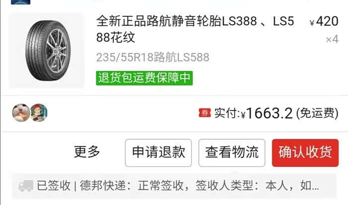 不过235 55 18的规格几个平台都没货,于是就定了路航LS588,打了线下轮胎店报价650一条包安装,在多多上420一条,