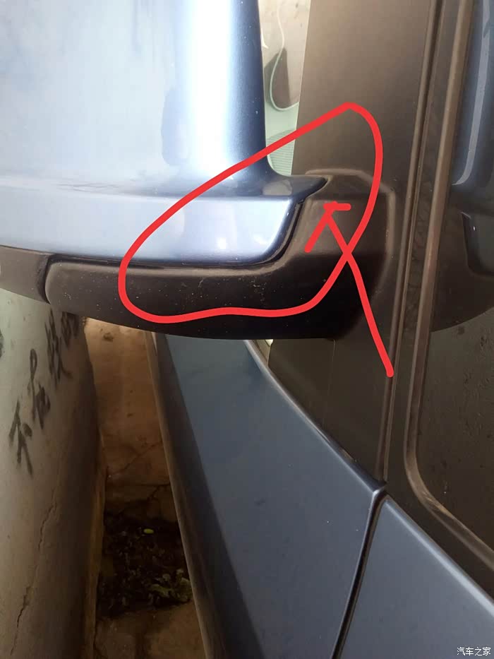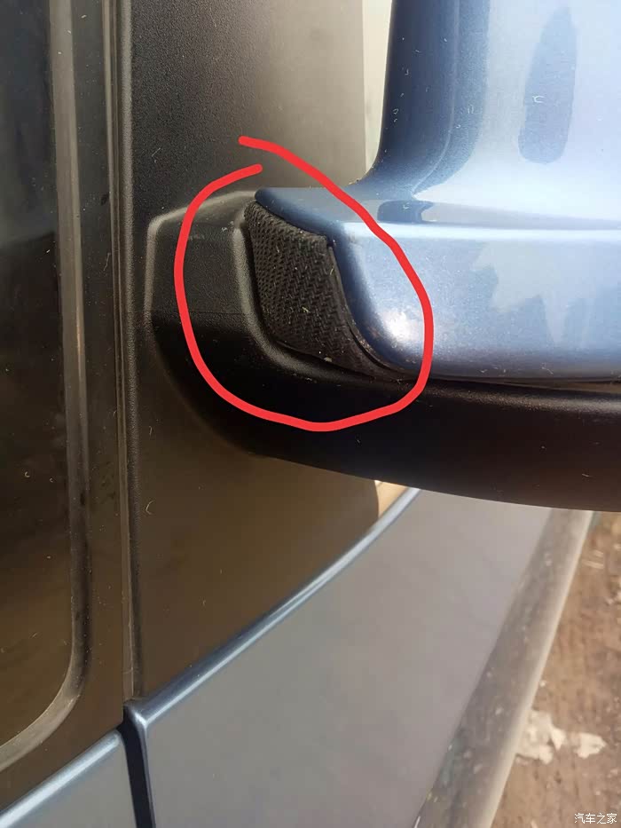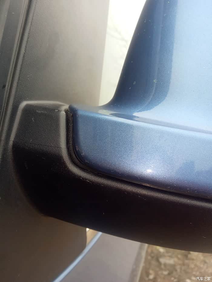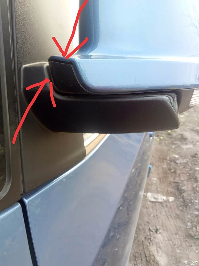 大家看看这是主驾驶后视镜,我标出位置,都翘起来了,很大缝隙,这样高速时候风一吹就会行成口哨声