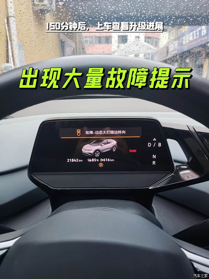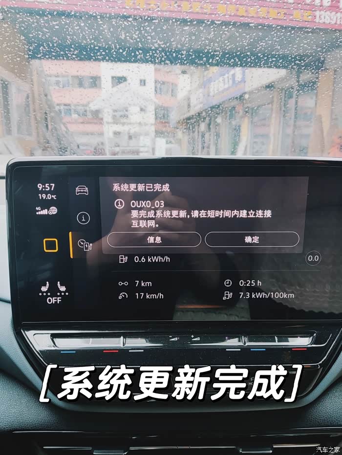 在大约一个半小时以后,我再次前往停车场,准备查看车辆的升级情况,顺便把车子挪到单位的停车场。其实在上车前我还是有心理准备的,我准备拿手机把可能出现的情况拍下来。坐到座位上后发现仪表盘上弹出了好多故障提示,等我用手机拍的时候只剩下最后一个了,提示:“故障:动态大灯随动转向”,不过这些故障提示都慢慢的消失了。紧接着中控屏幕也弹出了提示:“系统更新已完成,OUXO_03,要完成系统更新,请在短时间内建立连接互联网”。我点击了确定,接下来再也没有什么提示和对话框了,或许升级已经完成了吧。