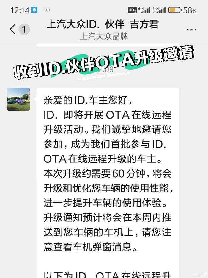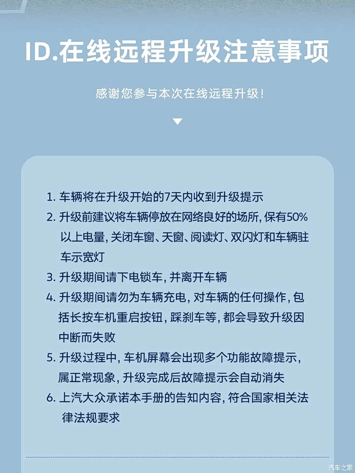 前一段时间听说上汽大众会给ID.系列的车子进行在线远程升级,也就是OTA,还是有点期待的。五月下旬的时候,真的有ID伙伴联系了我,说了升级的注意事项,鼓励我去升级。从此以后我每天观察车机的变化看看有没有升级的信息,听车友说把车机账号退出再登录就可以升收到级信息,于是我好多次把账号退出,然后再登录,看看有没有收到升级的信息,可是依然没有任何反应。不过今天早上停车的时候突然发现车机上真的有了升级的相关信息,赶紧按照在线远程升级的说明,开始升级车机。下面就分享一下升级的过程和车机的变化吧。