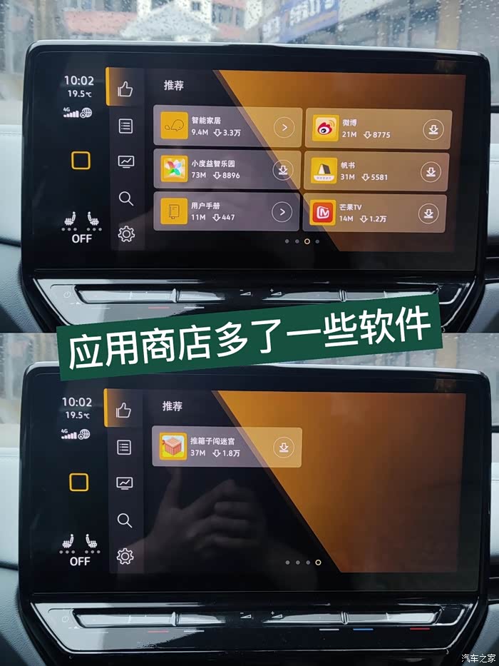 这次升级变化最大的就是应用商店,里面似乎多了好几个软件,至少有两个是游戏软件,说明在车机上也可以玩儿游戏了。