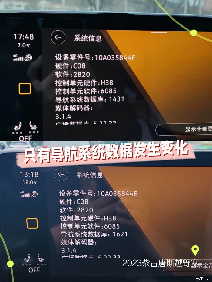 这次升级以后发现车机的界面,包括功能,图标的样式,个数和原来几乎完全一样,并没有什么显著的变化。软件系统信息的数据基本一致,只有导航系统数据库由1431变成了1621。