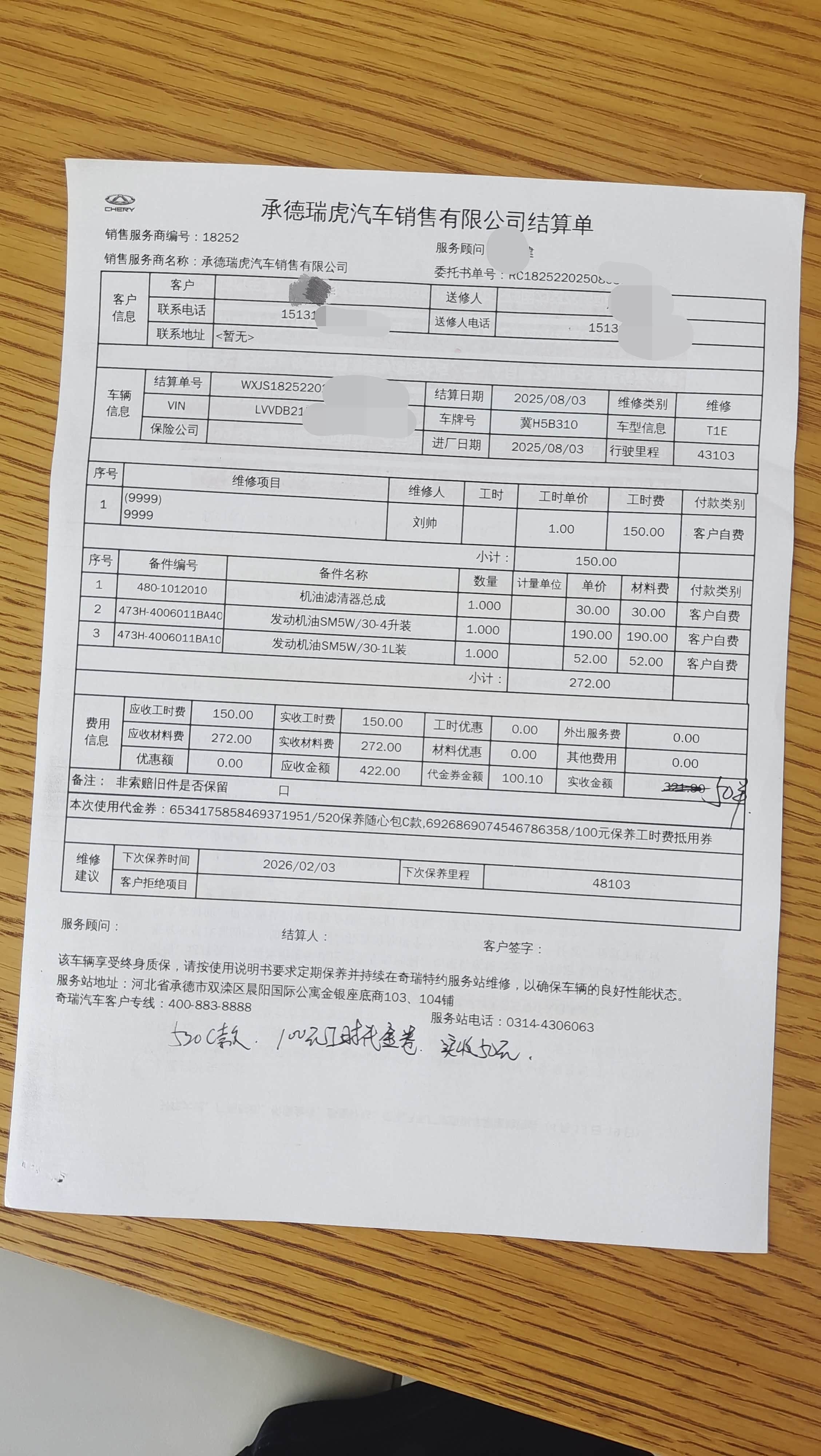 下面我来说一说大家最关心也最想知道的一个问题,那就是保养的费用。首先是油费,刚才上边说了,来回一百二十公里左右,差不多七八十块钱的油钱,如果走高速来回再加五十块钱,我选择不走,国道也挺好走。再就是工时费,我的是1.6T的排量,工时是150块钱,固定的,但是用了一张券,实际付款为五十块钱。最后就是保养费用,在网上提前团的券,520块钱三次基础保养,平均一次一百多点,这就是我的虎子一次保养的费用。总体算下来一次保养三百多。我觉得不坑,可以接受。