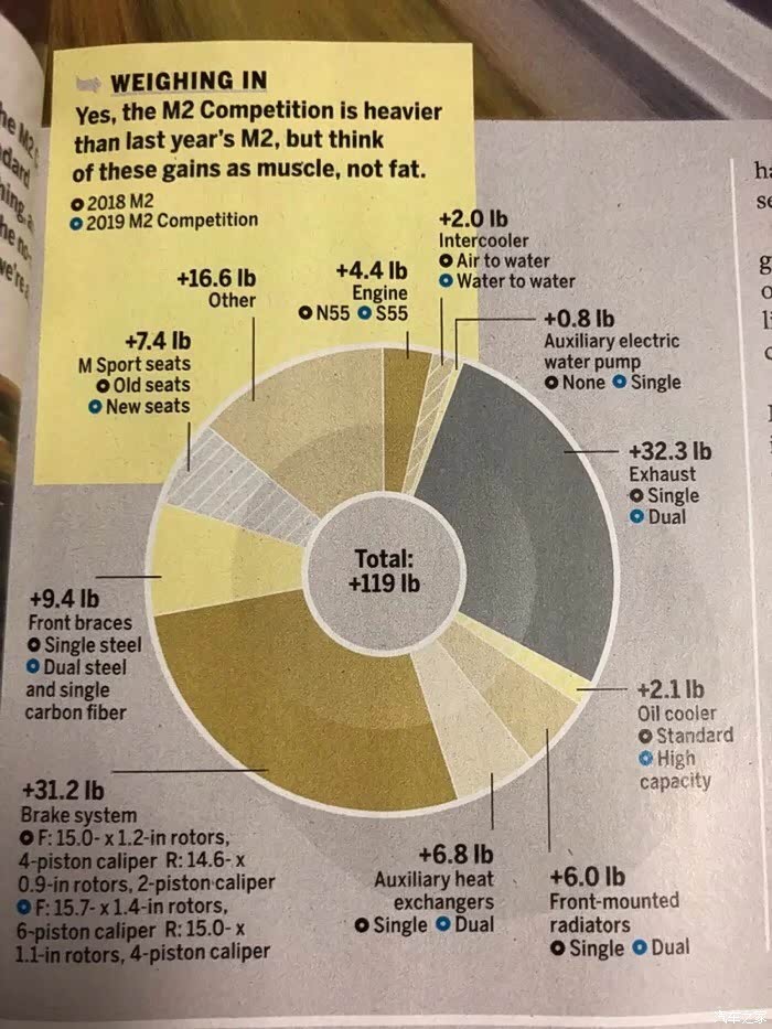 其中表示主由n55换装为s55引擎的重量几乎可以忽略不计 主要重量来自于选装的788和前6后4卡钳 这部分影响最大 也是导致配重失衡的关键 还有就是排气 主持人说闷 有点闷 可能和m2c装配的gpf有些关系 觉得有潜力没被发掘出来 在这里求问广大车友怎样解决上述两个问题让m2c变得更好!!!