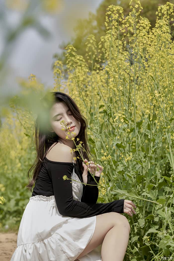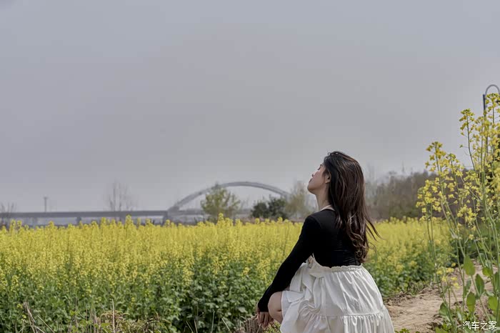 油菜花田前面,采用了标准的人车分流,好好的给01来张帅照,背后的一片金黄色油菜花田,洋溢着春天的气息。