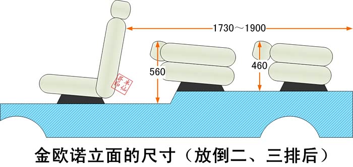 金欧诺因为是后驱车,第二排开始地板升高了10厘米,这样放倒第二、三排后最高处与地面的高度是不一样的。第二排放倒后最高处(头枕)与地板高度为56厘米,第三排放倒后最高处(头枕)与地板高度为46厘米。