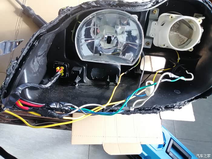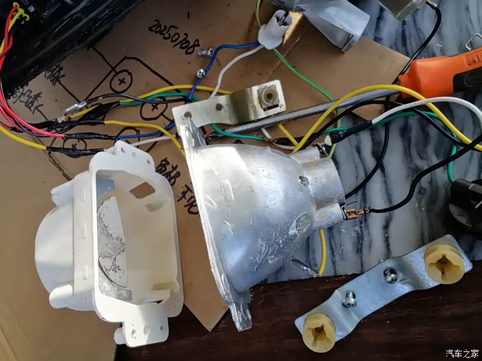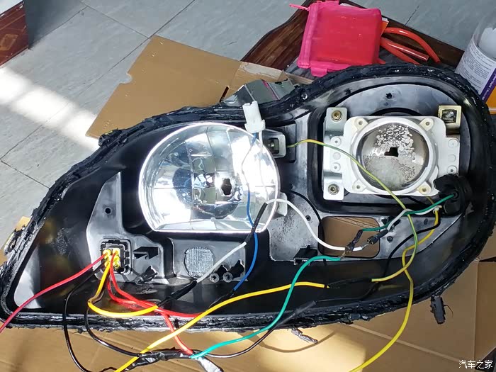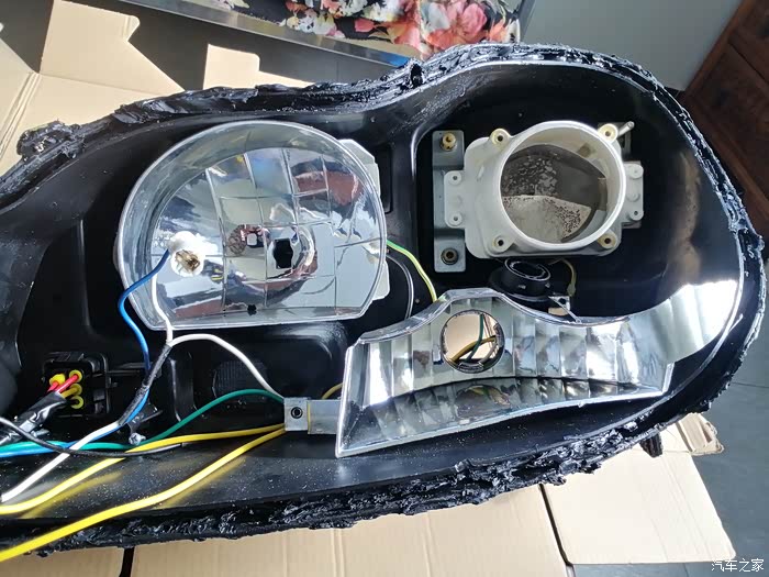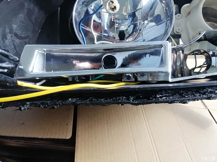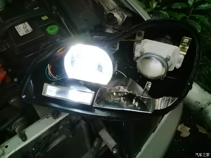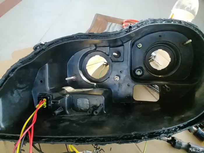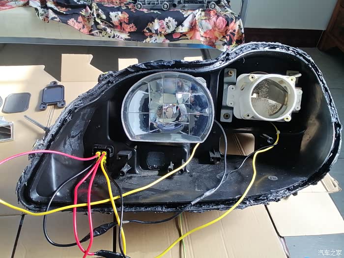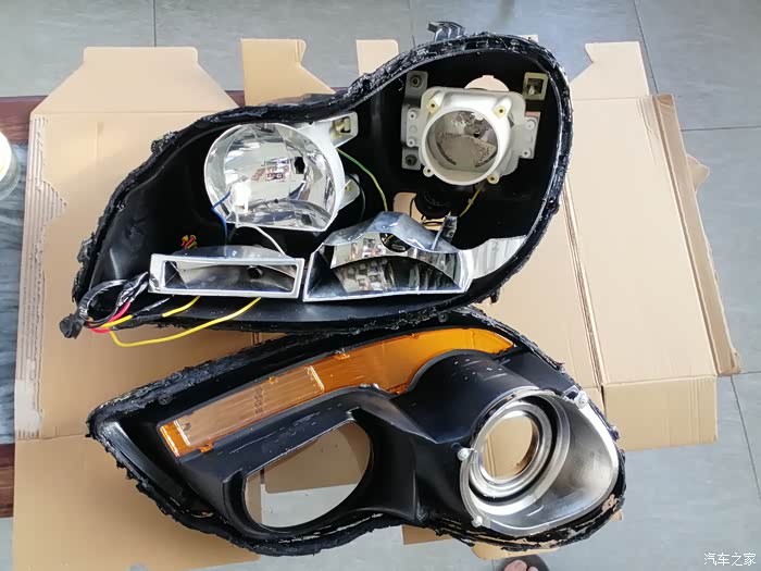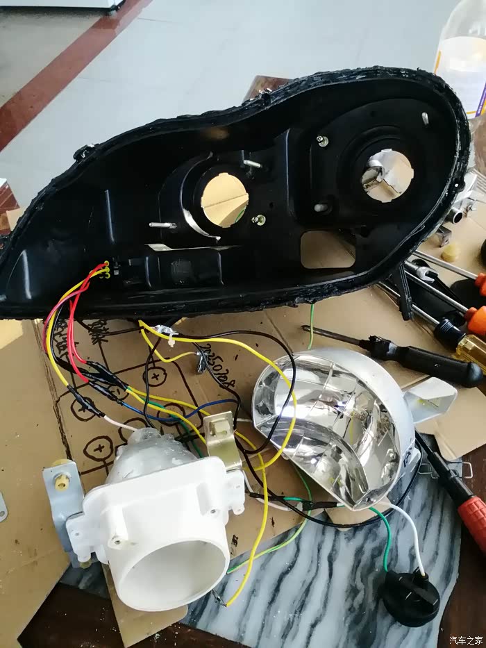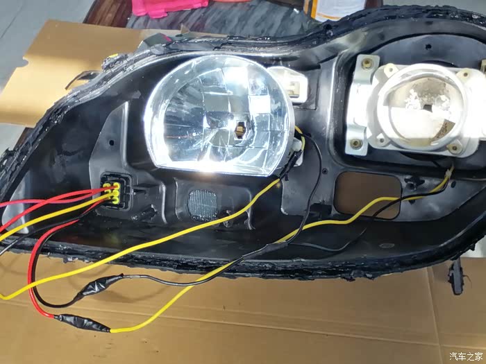 完完全全拆解,更换电线,换LED灯泡,灯罩重新粘贴,大灯插头更换新的。一次点亮,非常亮。开心!