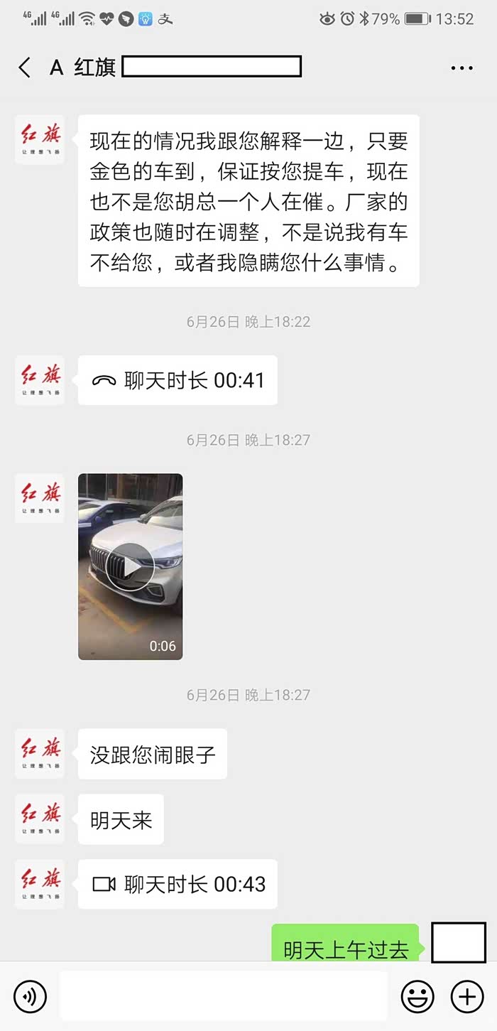武汉红旗就两家4S,5.18第一次试驾,价格还未公布,第一眼看到实车。我心动了! 后来的试驾,说实话真的没有感觉。要总结的话:好,很好,非常好!没毛病。因为价格未确定所以恋恋不舍的回家了。6.5号去4S讨价还价,回复没优惠。因为管家还不知道我在看车,最终没忍住订车,心里又高兴又害怕。管家说了,不能买国产。忐忑回家,一直不敢跟管家说。背地里一个劲催销售。(直到一个星期之后管家被死党兄弟劝服才松了口气)