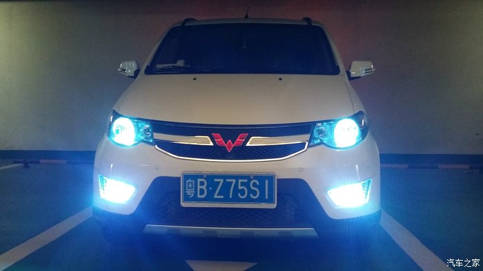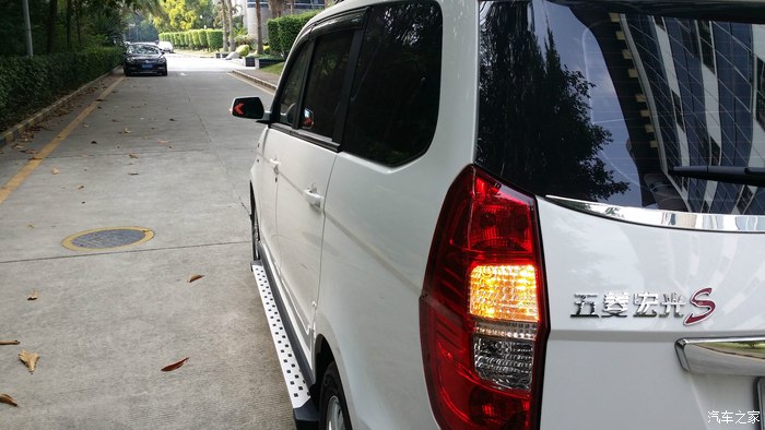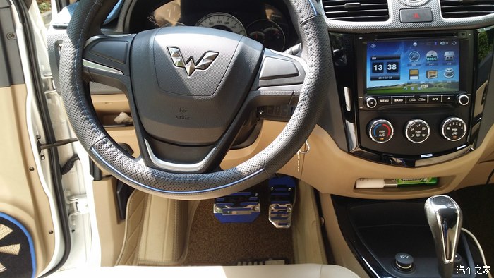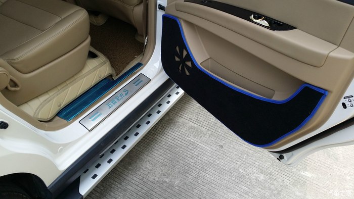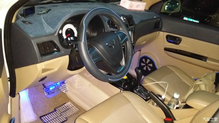 外观除了灯光,还有就是扎实的迎宾踏板,瞬间能使整车高大上很多,水钻牌照框框,带箭头灯的大视野蓝光后视镜也很赞,尤其是晚上!整车由外观向内饰延伸的就是迎宾踏板了,用料扎实,很厚的不锈钢,我甚至都觉得厚过头了,就是防踢的么!~对,还有门内板防踢垫,买的时候本来是冰蓝色,寄过来个深蓝色的就凑合用了,但粘的不是很结实,**!仪表避光垫必须赞,颜色做工都很喜欢,同样问题,粘不牢靠!油门刹车踏板装了两个蓝色不锈钢的,很炫酷,可是油门踏板装反了,一直也没时间转过来!挡泥板有蓝色宏光S的字,因为踏板的关系,只能装后边的了,前边被踏板占去了位置。脚垫也很赞,用料扎实很贴靠。方向盘皮套依然蓝色,就连钥匙的皮套也都是蓝色的。。。蓝配白,好看么~~~后挡风玻璃上装了一个不锈钢的装饰条,也提升了不少档次!