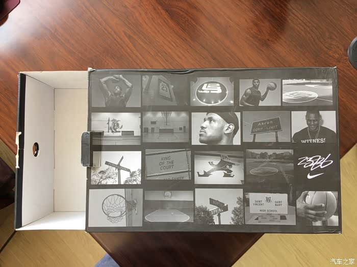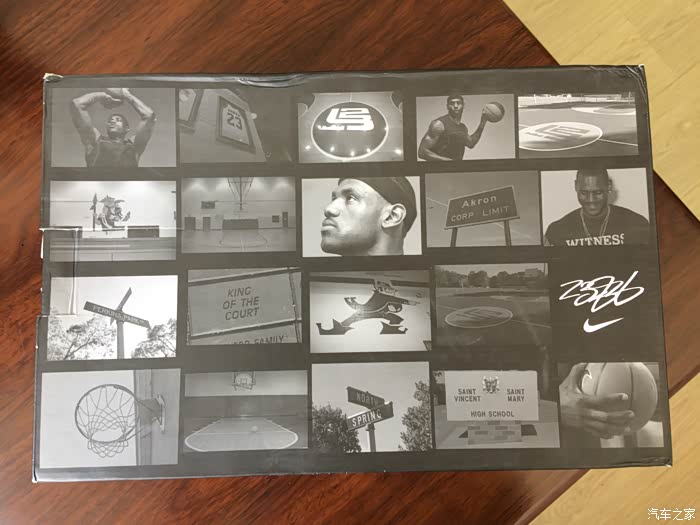 作为LBJ的定制款战靴,包装盒自然也是精心设计的,不同于一般运动鞋相对统一的橙色的包装盒,这双鞋子的盒子上到处都是和LBJ有关的画面。
