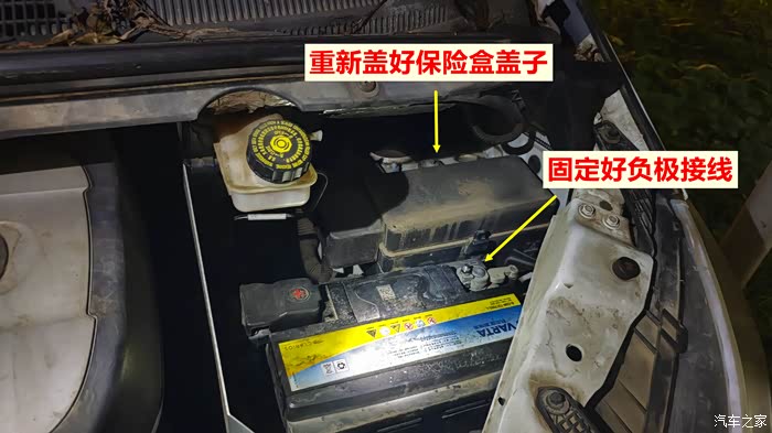 再就是拆下电瓶负极线来试试了。这个拆卸很简单,用套筒扳手把负极固定螺丝卸下来,取下负极接电线,等待一两分钟,确保电路充分断电,再重新把负极电线接上,再尝试点火,结果一下就正常启动起来了!看来就是车友们提示的电脑bug问题了!