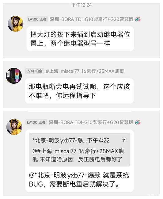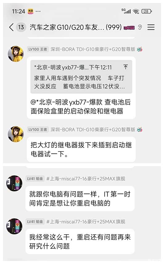 这个故障确实以前没遇到,赶忙车友群里咨询。其实在大上周末喇叭不响后,周一二我就在车友群里进行了咨询,热心车友建议检查下喇叭保险丝和继电器。