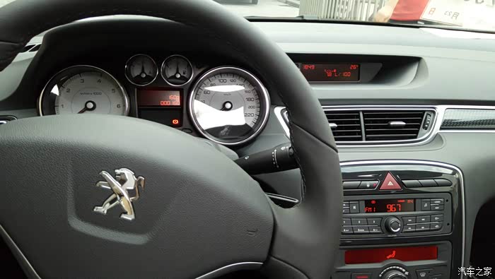 内饰是308在这个级别里最引以为傲的地方了,中控台运用了大量的搪塑工艺,全部都是软材质的,摸上去手感很好!中控部位呈三层跌退式,最上面是行车电脑(显示油耗、瞬时油耗、平均时速、时间日期、剩余里程等)由雨刮器端头按钮点击实现转换。中间的空调出风口,空调很给力。最下面的就是收音机和空调控制面板了,不太满意的是车门锁开关怎么会安在中空处收音机上面呢?应该安装在四门集控位置才对啊!