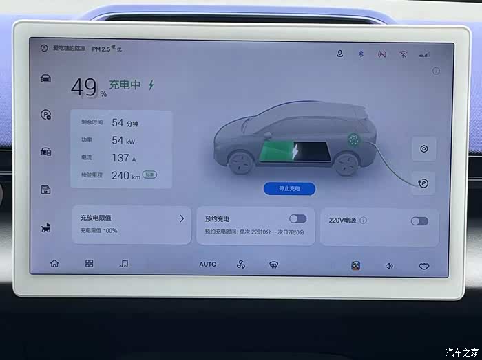 当电量充至49%时,充电功率降低至54kw,电流降低至137A。