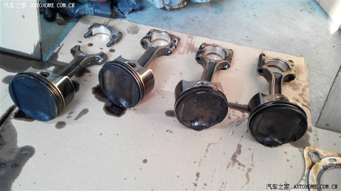 拆下的活塞,小师傅说左边第一缸有点积碳。别的都好。