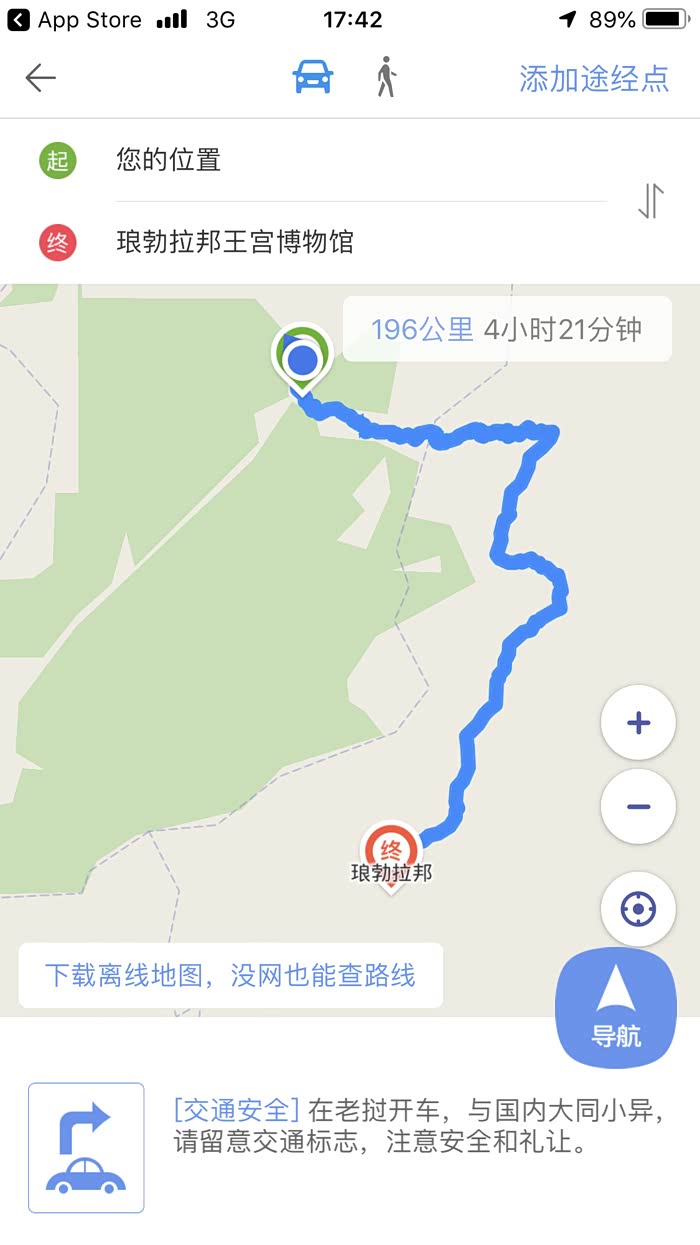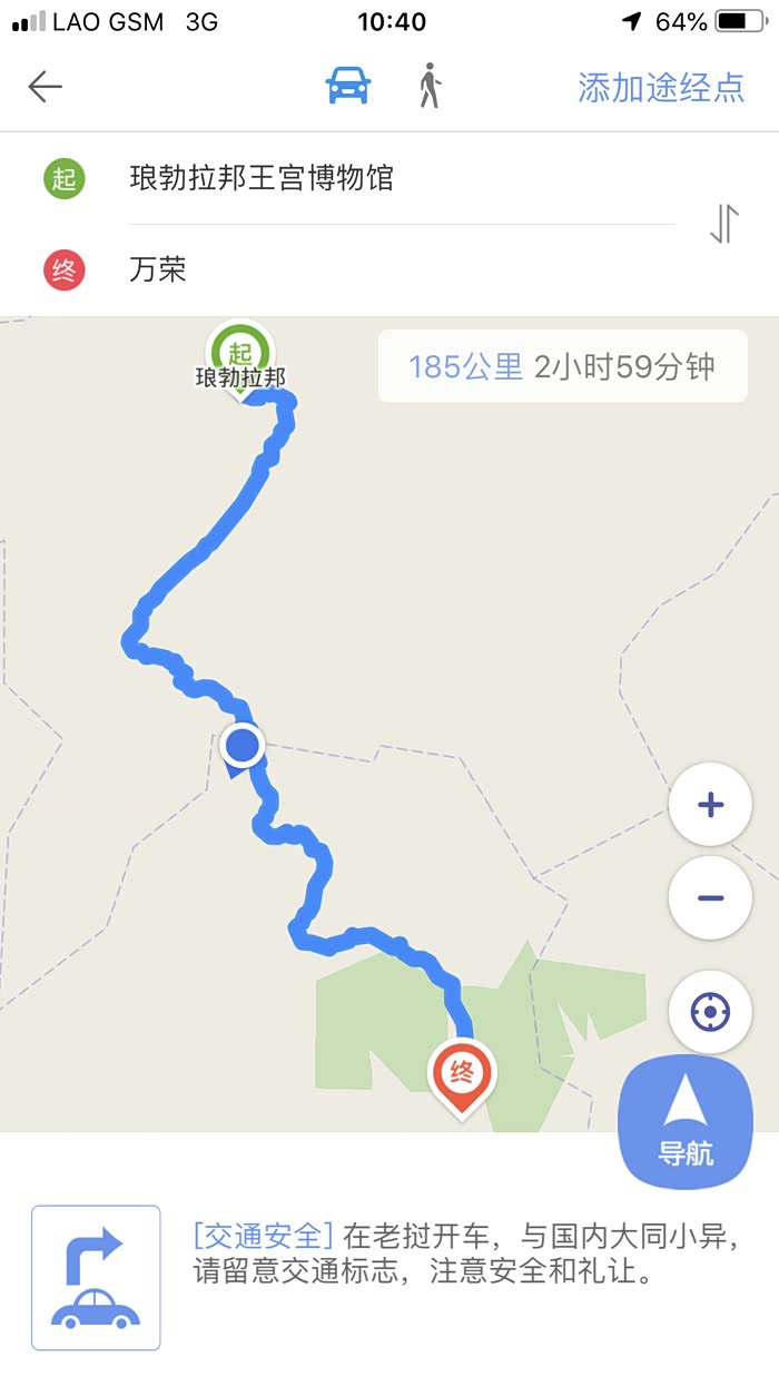 国内经常使用的导航基本上无法使用,只显示公路名称(老挝唯一的主班干道13号公路)和大约路长多少公里和行驶时间。