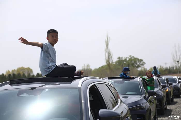 中间休息期间,让车里重量比较轻的小朋友来车顶合影。