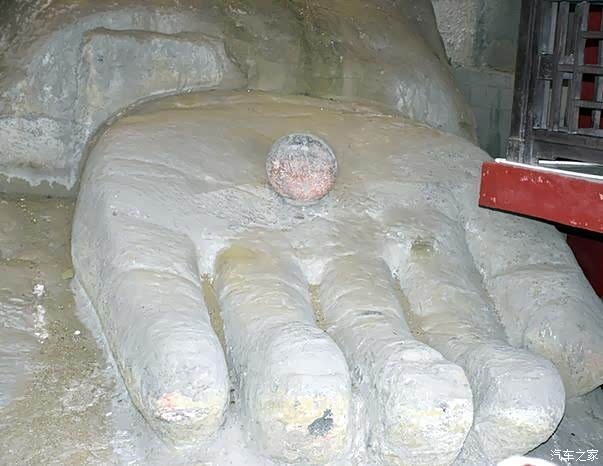 阁楼的第二层可以到达大佛的胯部,这里能看到大佛的手里拖着一颗石珠,身上有许多一毛和五毛的硬币,没有发现一块的.