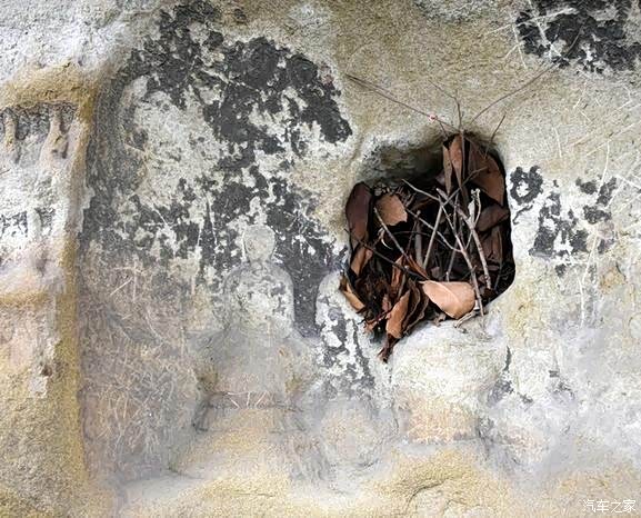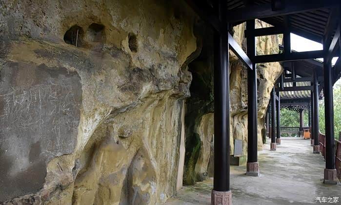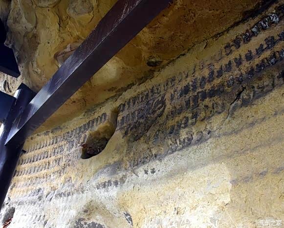 仔细来看,你可以发现岩壁上面有许多的柱洞,这也许是古人在开始的时候为了保护摩崖石刻,而做的栈道的柱洞吧