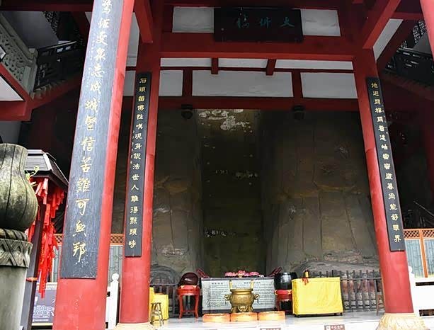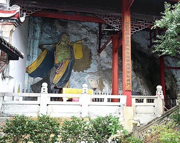 达摩全称菩提达摩,南天竺人,南朝从海道来华,在建业曾与梁武帝面谈不契,虽一苇渡江,在嵩山少林寺面壁十年,是中国佛教禅宗的创始人,而大佛寺下的这个达摩渡江石刻建于清朝嘉庆二十一年公元1816年,高4.9米脚踩芦苇。稳立于鱼翻浪滚的汹涌波涛之中,形象传神,是清代石刻的上乘之作。