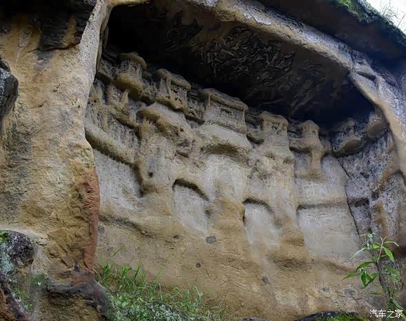 风化连同破坏掉的摩崖石刻,可以看出上方的一排排千佛的造型,其实这些盘坐的佛爷是远古年代供奉人的家佛