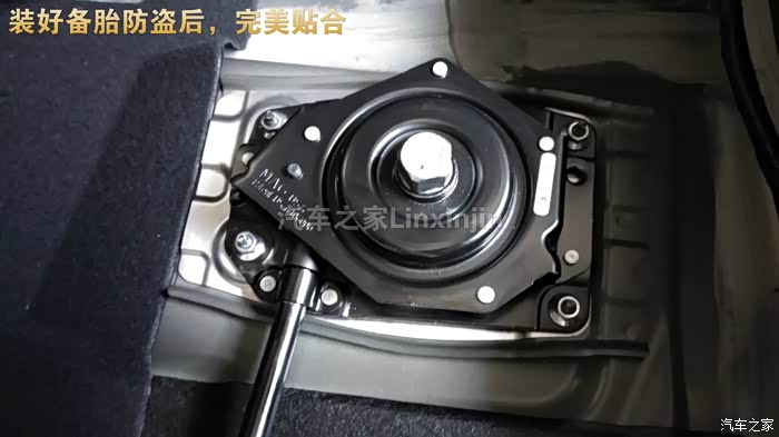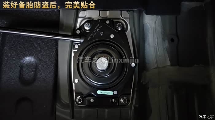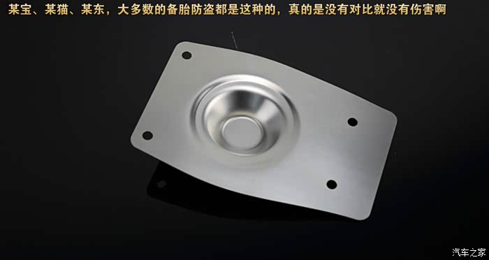 。提醒:安装备胎防盗前要放下备胎,因为备胎太重,如果不放下来的话,上面的那个盖盖会移位,那4个螺丝口会对不上了。我是发现问题后才总结出来的,卖家的安装方法里面没有提到这点!