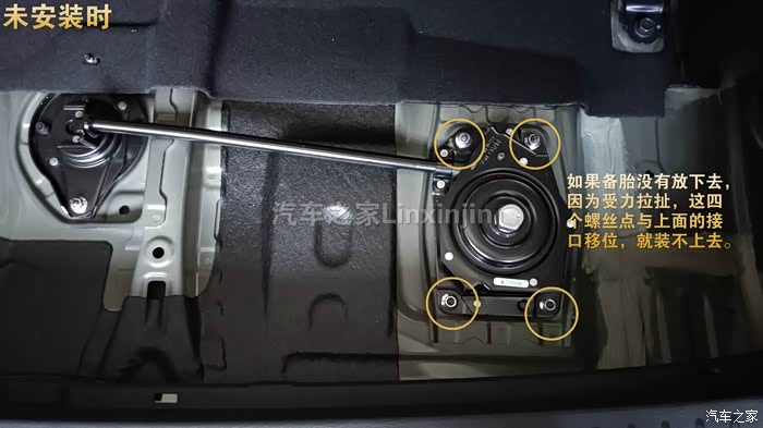 提醒:安装备胎防盗前要放下备胎,因为备胎太重,如果不放下来的话,上面的那个盖盖会移位,那4个螺丝口会对不上了。我是发现问题后才总结出来的,卖家的安装方法里面没有提到这点!