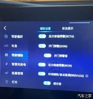 第二个呢,官方说它是10万级唯一标配主动安全的插混SUV,这一点我是信的,我的小蓝就搭载了包括开门预警、后面穿插预警、并线辅助之内的好多功能,这些在车机菜单里面都能看到,我是建议保持开启状态。这样不管是行驶在路上打算变道,还是等待红绿灯时,侧面、后方有车辆靠近,后视镜光标都会闪烁,并且会有警报声响起,特别有安全感。