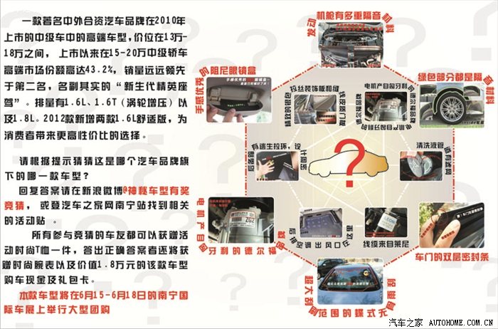 4、 6月15日-18日的东盟国际车展,本次车展将有该款车型的大型团购,将有空前绝后的价格优惠,并在本次车展上颁发各种奖项,报名参加活动的网友欢迎大家到现场,经销商会给网友发精美纪念T恤一件,还会给答对的网友发放时尚腕表。