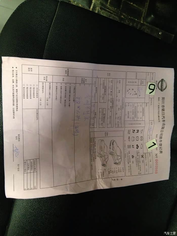 本人是在之家第一次发帖。四月一号提的手动尊雅版十二万多全包。在广东阳江铭日4S点提的车。刚提的车第二天就跑了五百多公里,第三天还是跑了五百多公里。记得那天晚上回来时有下小雨。清明节那天就发现大灯进水了。第二天就跑回4S店保修。很爽快,立马答应帮我换。但需要定货。过两天就换掉了前两个大灯总成。很满意,比前两个配车的光很多。换灯过程我就忘记拍照了。也告一段落了。直到前段时间发现后面磨胎。又要换后桥了。伤!右后避震又漏油了,晕。还日产?差不多十三万啊老大。这质量没我之前长安欧诺一半啊,我之前欧诺十多万公里了就换了后刹车片和左雾灯泡还有火花塞。其他就换机油和机油滤清器还换了一次汽油滤清器。真的很省心。还以为换台贵点的坐着舒服省心,唉!前两天又发现空调不凉了。也不啰嗦了,心烦。帖是手机发的,看官们凑合看着吧,应该能看懂。我的语文水平真心差。下面就看图