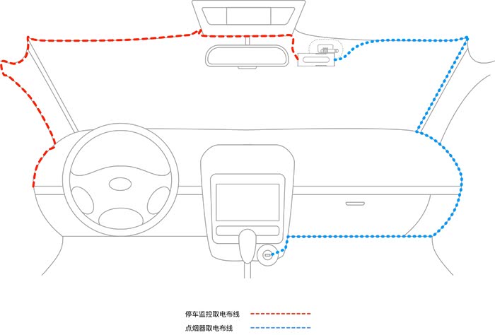点烟器、USB口取电:走线方法完全一样,只是接口不同,优点是自己动手就可以完成,缺点是熄火后会断电,则行车记录仪也是不能工作的。