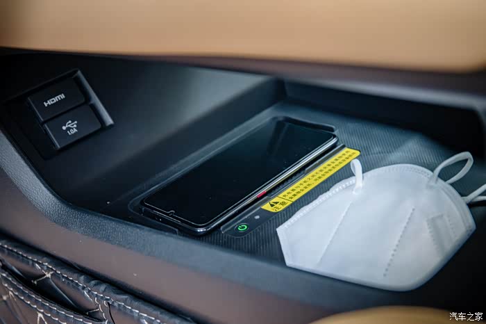 而扶手的下方也是一片巨大的空间,疫情期间这里用来放口罩再合适不过,同时除了普通的USB,还有无线充电。