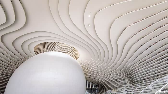 滨海新区文化中心图书馆是由原塘沽图书馆、汉沽图书馆、大港图书馆、塘沽少儿图书馆、汉沽少儿图书馆经过体制整合形成的大型总分馆制图书馆,由荷兰MVRDV建筑设计事务所与天津市城市规划设计研究院建筑分院合作设计。从天上看外立面真的非常不错,有一种让我之前去上海世博会的感觉。