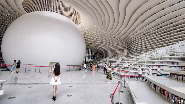 进入到图书馆免费,好在疫情期间没有关闭。图书馆的设计立意“滨海之眼”和“书山有路勤为径”。中间这个大白球就是眼,把这些波浪纹的设计就是山。设计藏书总量达120万册、读者座位1200个。