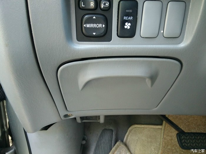 图左,倒车镜电动开关,图右,后风机开关,图下,小储物盒