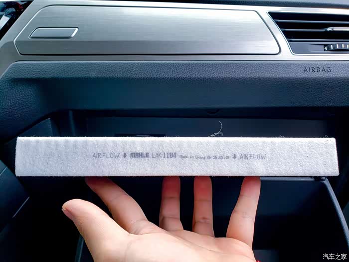 取出空调滤芯首先要看一下标示,对比原装滤芯可以看到安装方向、生产时间、产地等信息。