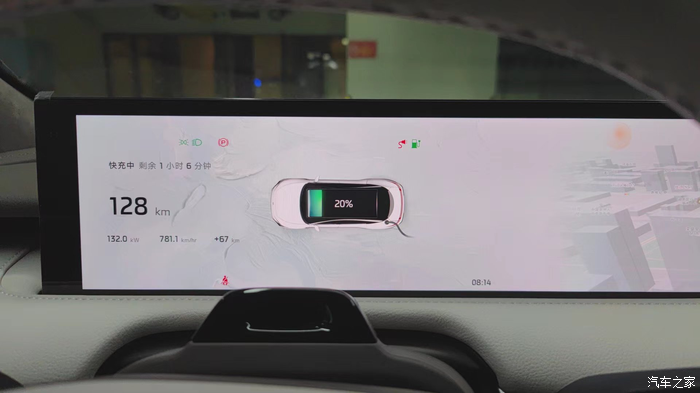 在后面大概约五分钟的充电过程中,车辆一直维系在130+千瓦的功率上(可见下面图六),这样的话充电效率确实是快,四分钟的时间,从续航里程69KM充到了128KM,大概是四分钟充了60公里。