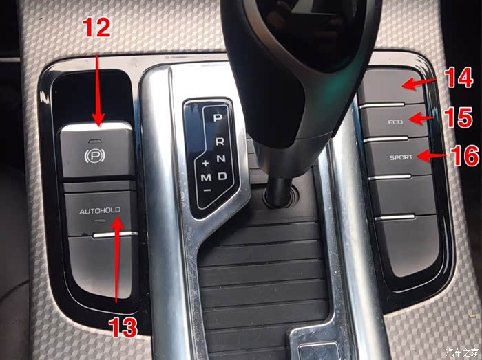 12:电子手刹。这个键我都几乎很少去动它。起步的时候无论D档还是R档只要系好安全带踩油门它就会自动解除,停车推P档脚刹不松,按熄火健它自己会启动拉手刹。(无招胜有招,科技最大的进步就是省力省心)当然了最大的直观感受还是它比传统手刹好看很多