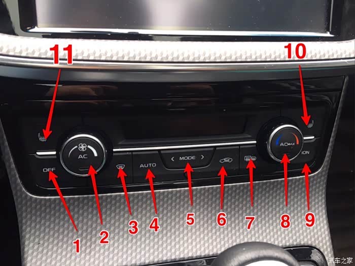 9:空气净化器开关。空气净化器有三个档位,点按可以循序切换,但无论在哪个档位都可以长按关闭。空气净化器是默认关闭的,每次上车都要打开,反正我多数时候是忘记的。