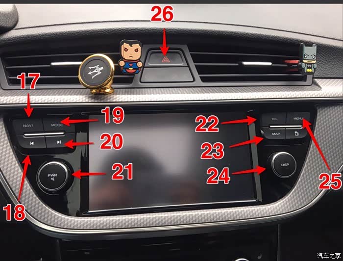 21:音量复合健,中间点按可以一键静音,外围旋转控制音量。感觉这几个键并不常用,和方向盘右侧几个键有多重复。