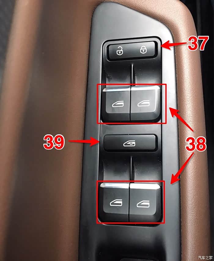 38:四窗玻璃升降键。这四个键都是两段式按键,轻按或者轻抬是跟随式升降车窗,重按一下或者重抬一下可一键降窗或者升窗。这个功能在车辆行驶过程中尤为省力。