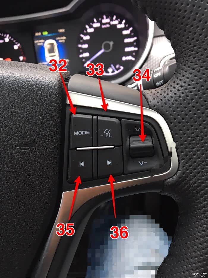 32:MODE点按和19功能一致可以切换音乐播放和收音机。长按可以激活切换仪表盘中间显示内容。有些小伙伴找不到胎压显示,长按此键在“滴”一声之后按35/36进行切换。还有其他方法,下文会讲到。当然了,这只是自动挡车型的切换方式,手动挡是没有的。手动挡只有胎压警报没有胎压数值显示。