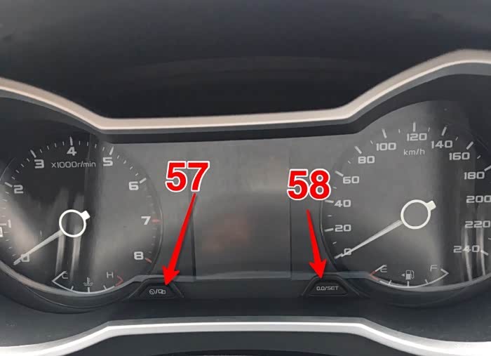 58:确认键,设置键。这两个键配合来完成对行车电脑的一些参数调整,比如设置时间设置报警时速,平均油耗清零等。也可以点按58进入设置菜单后长按32配合35、36来设置。
