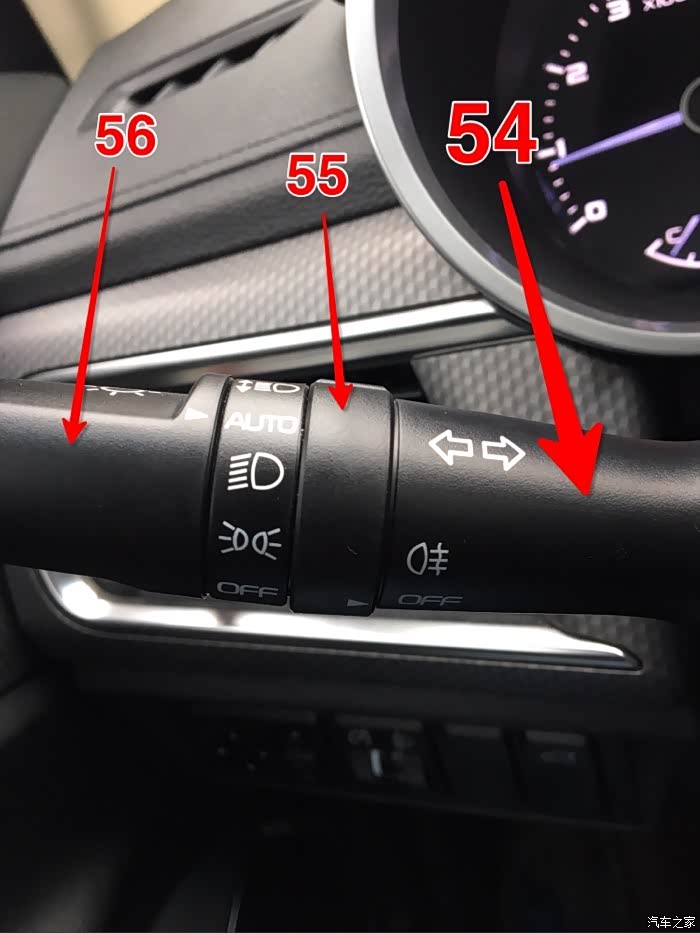 54:灯光控制杆。和雨刮杆一样也是四向的:向前拨是右转向灯,向后拉是左转向灯。转向灯开关也是两段式的,轻拨变道、重拨转向。变道灯开启转向灯闪三次后复位,转向灯开启后方向盘回正转向灯杆也会归位。向下按是远光,松手后不会回弹复位。向上抬是前大灯闪亮,松手后会回弹复位。