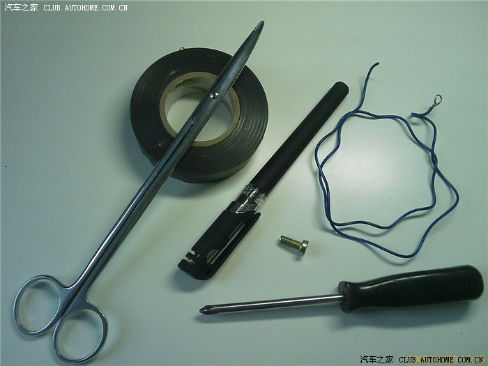 这就是全部的材料和工具,笔身直径φ12MM碳素笔一只,单根(单股多股都行)护套绝缘线、长40cm至50cm左右一根,φ6MM螺杆一只,超薄绝缘胶带少许,剪刀、起子。