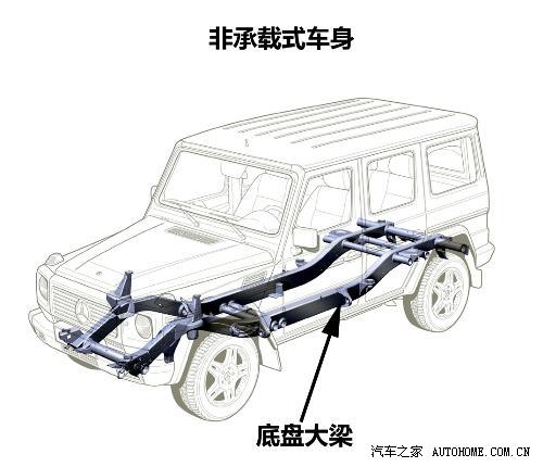 非承载式车身的汽车有刚性车架,又称底盘大梁架。车身本体悬置于车架上,用弹元件联接。车架的振动通过弹性元件传到车身上,大部分振动被减弱或消除,发生碰撞时车架能吸收大部分冲击力,在坏路行驶时对车身起到保护作用,因此车厢变形小,平稳性和安全性好,而且厢内噪音低。但这种非承载式车身比较笨重,质量大,汽车质心高,高速行驶稳定性较差。