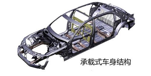 承载式车身的汽车没有刚性车架,只是加强了车头、侧围、车尾、底板等部位,发动机、前后悬架、传动系统的一部分等总成部件装配在车身上设计要求的位置,车身负载通过悬架装置传给车轮。承载式车身除了其固有的乘载功能外,还要直接承受各种负荷力的作用。承载式车身不论在安全性还是在稳定性方面都有很大的提高,它具有质量小、高度低,装配容易等优点。