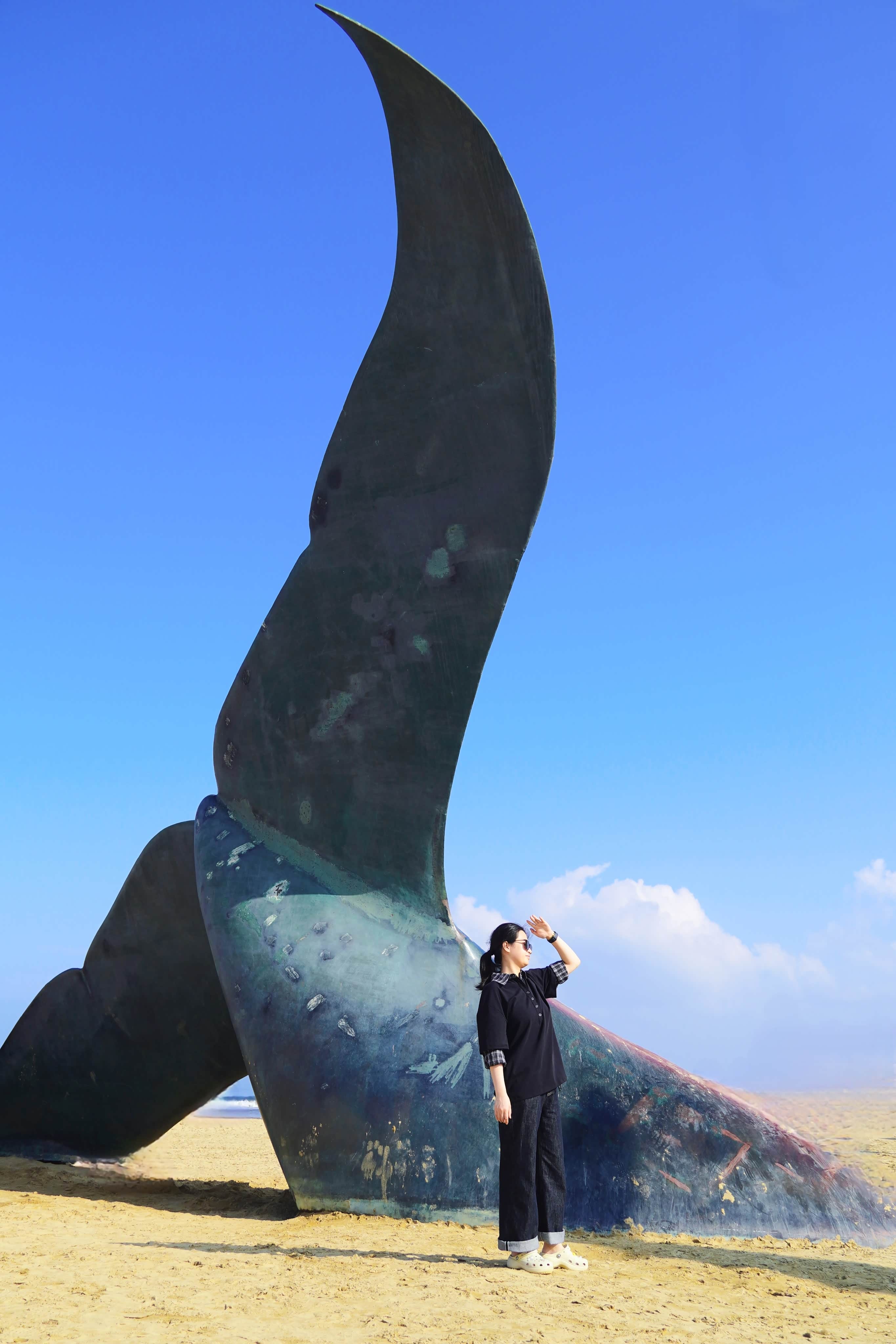 烟台网红打卡点孤独的鲸,很多人都动不动要把这条巨大的鲸鱼雕塑全景拍摄导致人物看起来找不到主题感缺乏互动,其实我们完全可以找重合角度来增加人与鲸鱼雕塑的互动感,只需要拍摄局部也能让观众看到画面想要表达什么。当然了由于网红景点难免画面有路人变得嘈杂,取景角度我们可以刻意避开人流,画面越干净越有艺术感。