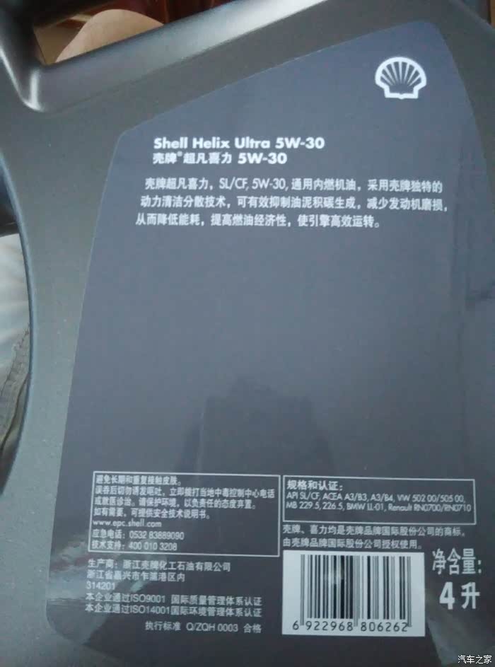 网上某宝买的灰壳sl5w30全合成机油,感谢机油论坛大神咕咕叽叽哈哈呵呵的指导和推荐,在cctl买的灰壳sl5w30。自己又买了曼牌的机滤。汽修店50元人工费搞定。
