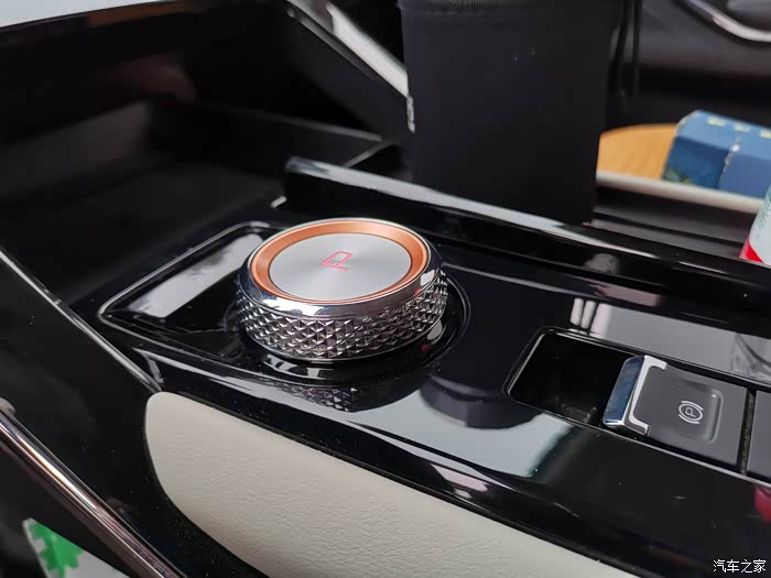 旋钮式电子档杆,黄色的内圈和内饰的装饰条颜色一致,外面菱形设计手感不错,停车后直接熄火可以自己切换回P档,很方便。